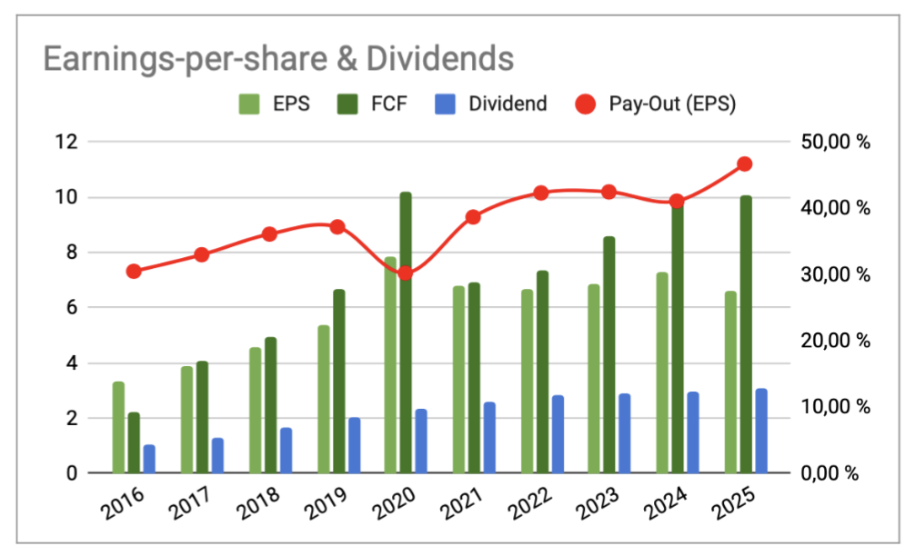 El dividendo, además, me gusta más por su calidad que por su tamaño. No me parece una remuneración diseñada para impresionar, sino para sostenerse. Está bien cubierto y no transmite la sensación de que la empresa esté forzando la máquina para repartir.